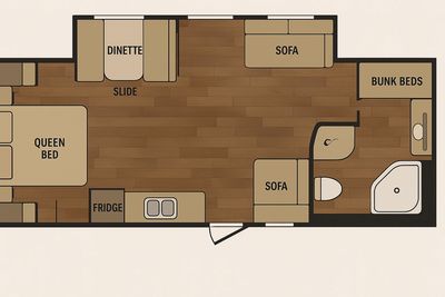 Master bedroom in the front and bunks in the rear with a single slide to expand the living area. This gives you the living, dinning and meal preparation spaces you need and the best sleeping arrangement for your family and friends.